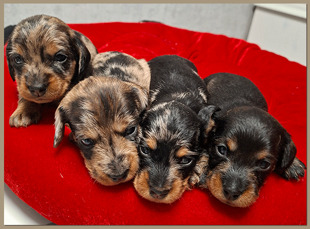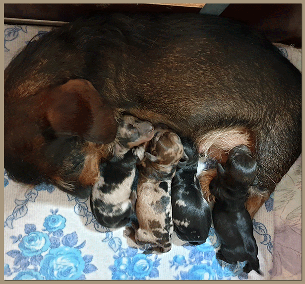 zwei Rüden und zwei Hündinnen in den Farben gefleckt und dkl-saufarben geworfen.
